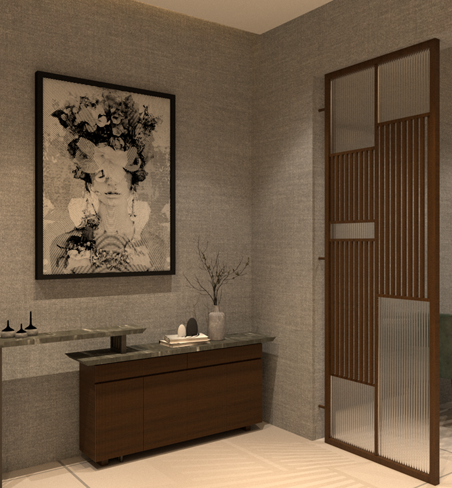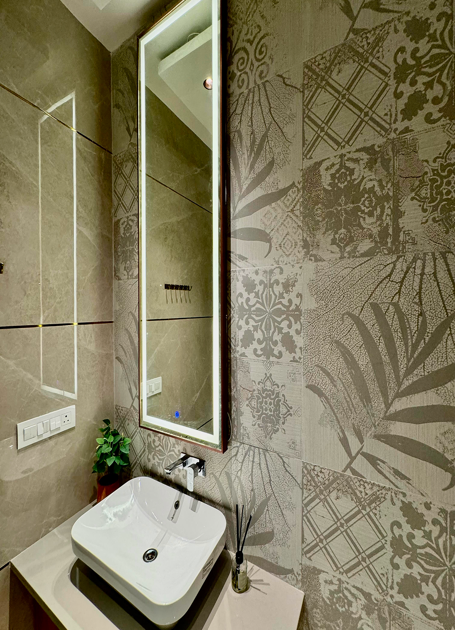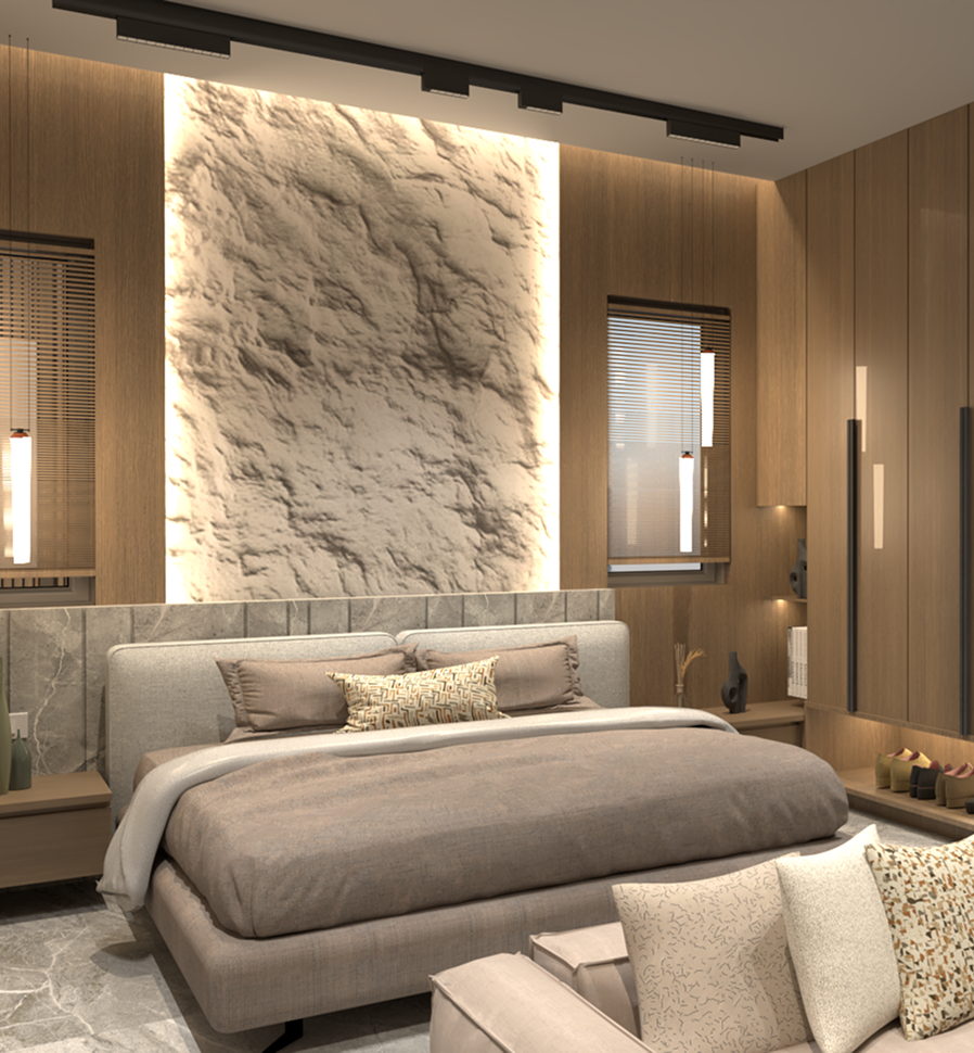 The private and utility spaces continue this design narrative with equal attention to detail. The bedroom features an elegant textured accent wall and modern pendant lighting, creating a serene retreat within the home.