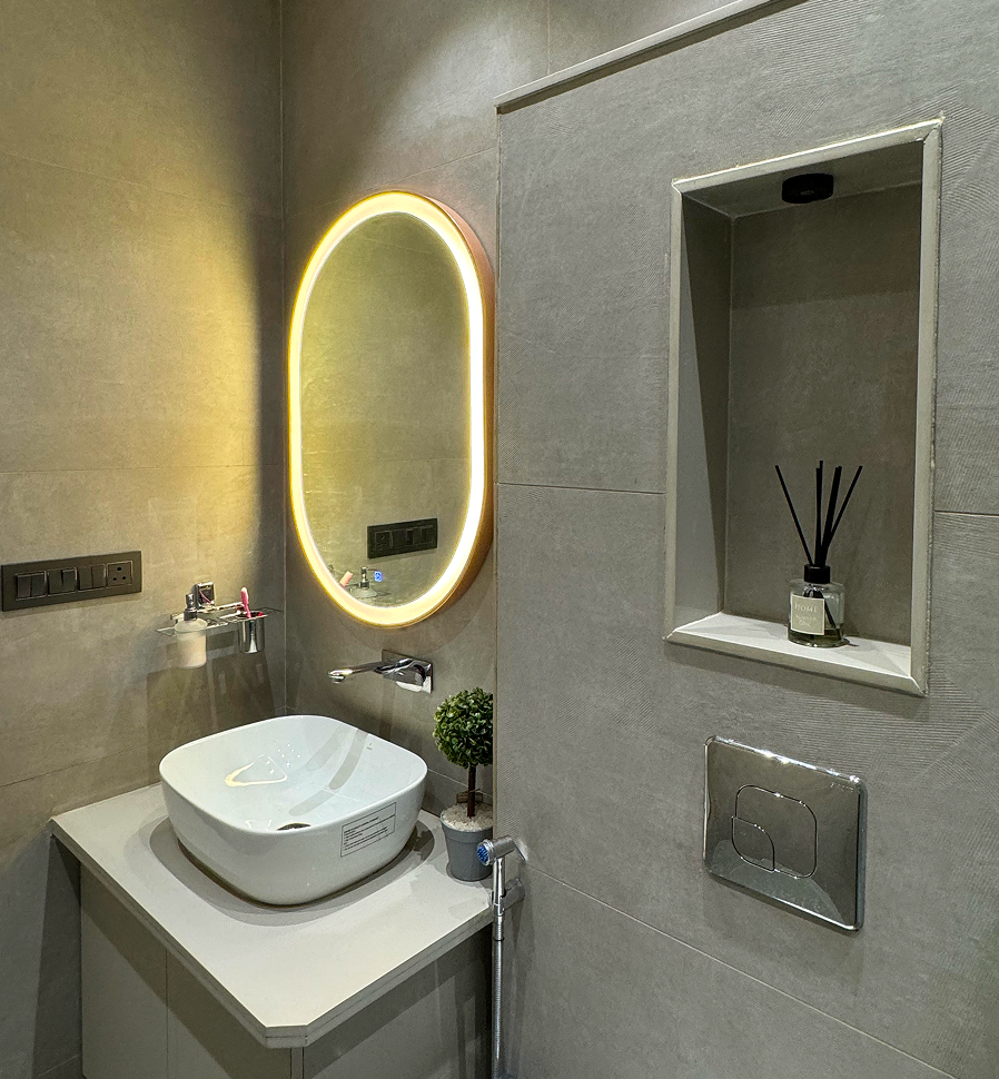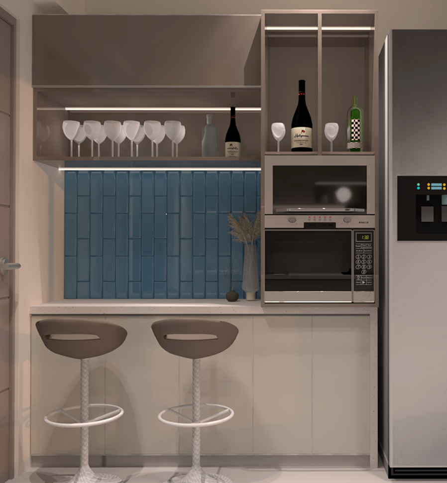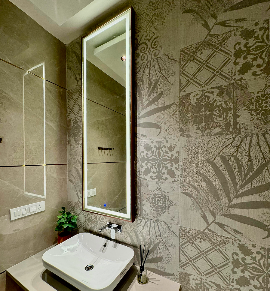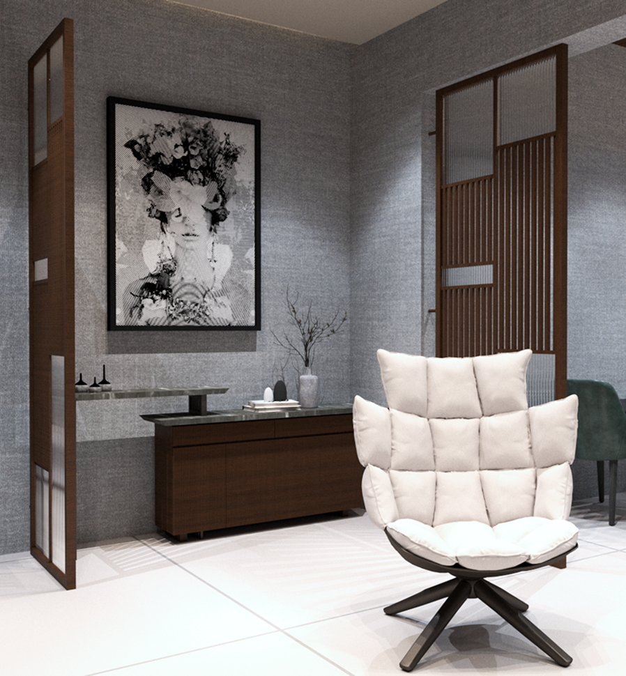 The private and utility spaces continue this design narrative with equal attention to detail. The bedroom features an elegant textured accent wall and modern pendant lighting, creating a serene retreat within the home.