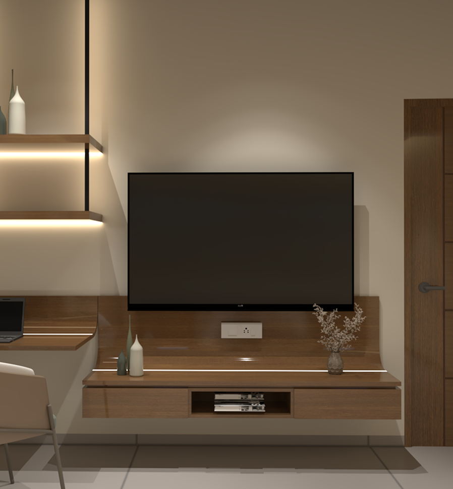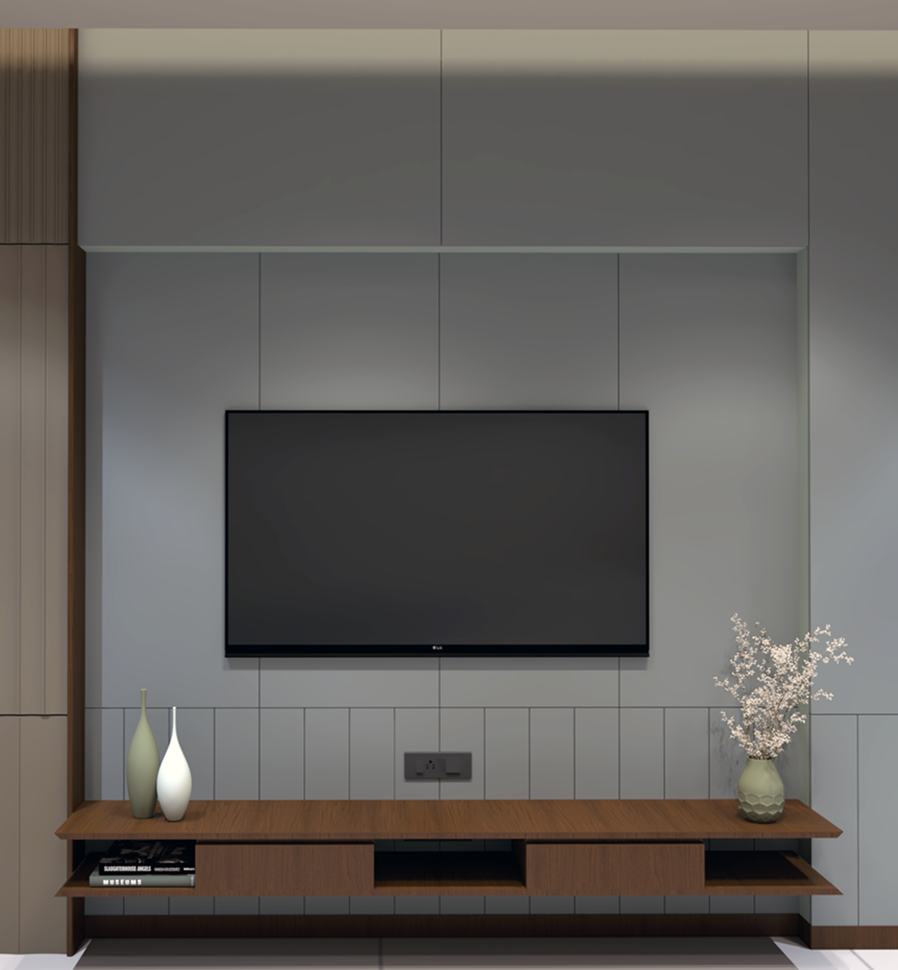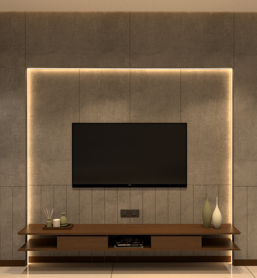 The entertainment area showcases a modern mounted TV unit with integrated backlighting, while the seating arrangement creates an inviting atmosphere through its carefully selected gray upholstered pieces and minimalist accessories.